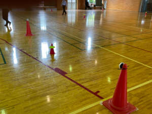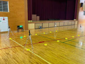 ターン力は両脇にコーンを設置し真ん中からスタートします。センサーが光った方に走り出し、光った方のコーンを回りそのまま反対側のコーンを回って最初に光ったセンサーに触れるまでの速さを測定します。